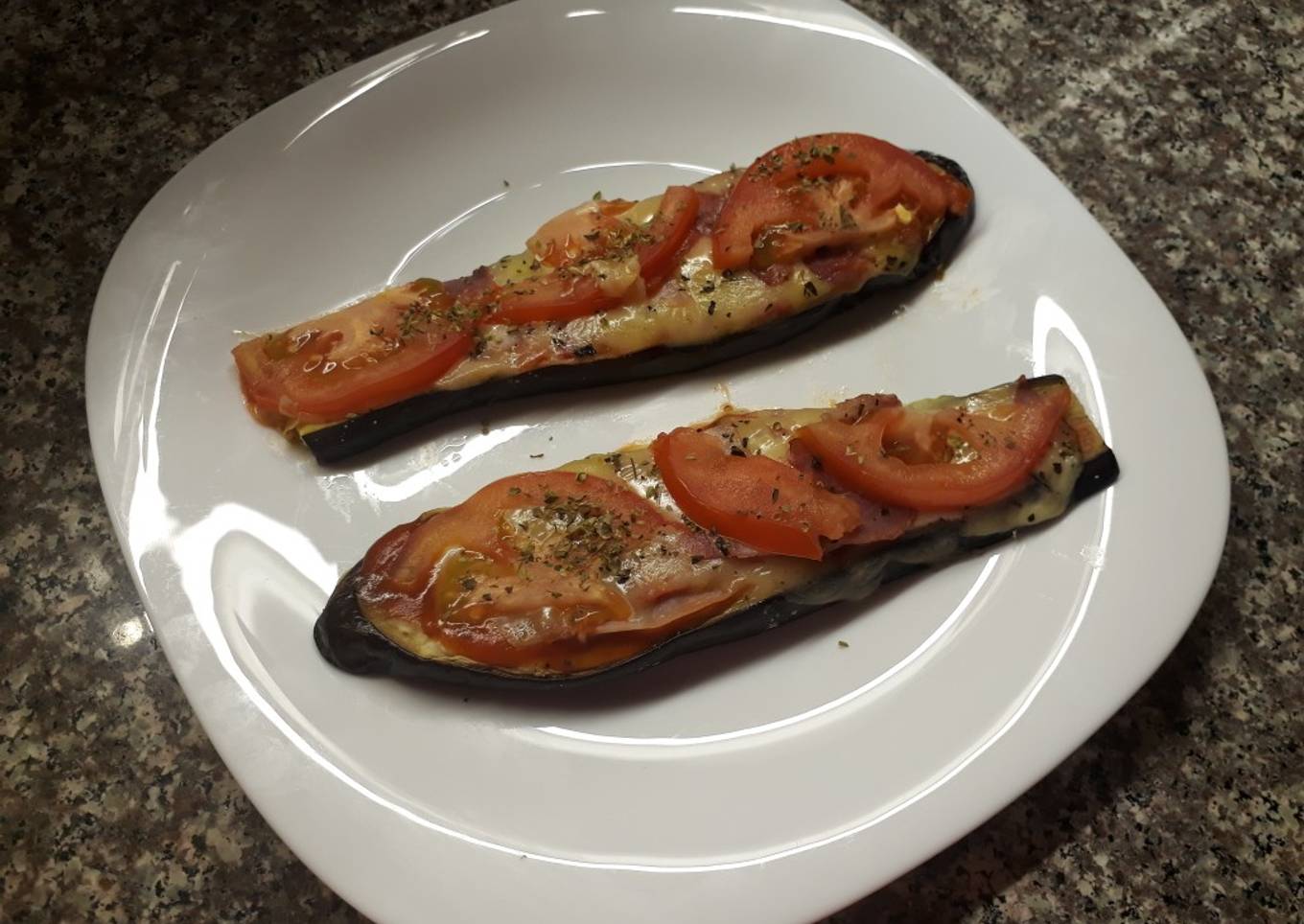 - Sacamos del horno y le ponemos la salsa de tomate, a cada una un trozo de jamón, de muzarela y de panceta. La cantidad es a gusto. Yo usé lo que me quedaba en la heladera que no era mucho. Para una sola berenjena dio bien.
