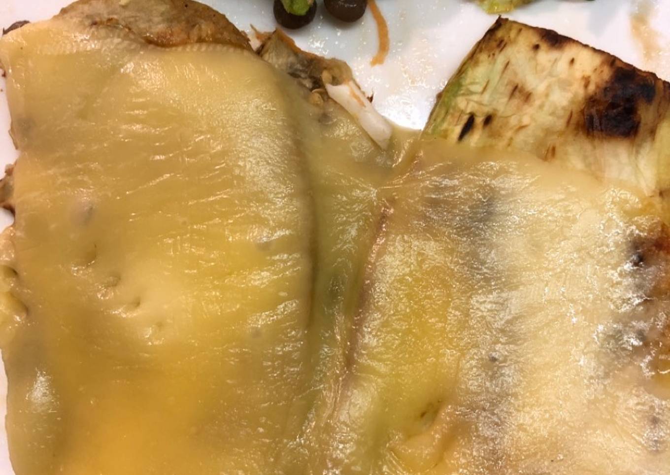 - Acomodar las berenjenas ya asadas en un plato apto para microondas y cubrirlas con las fetas de queso, llevar 1 minuto al microondas para que el queso se funda.