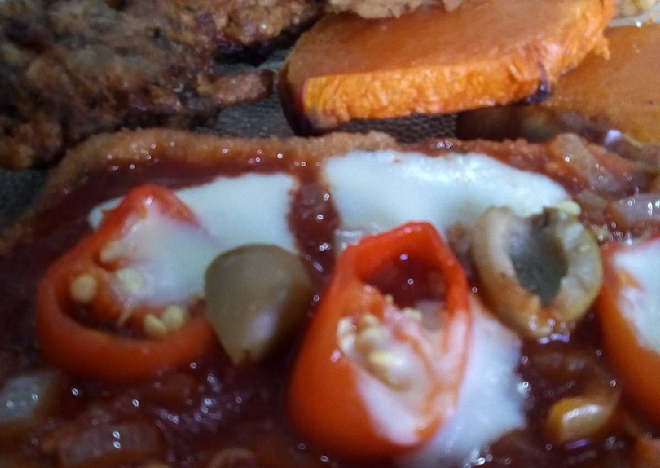 - Preparar la salsa lista y poner por encima de las berenjenas. Queso cortado en cubos, aceituna y llevar al horno nuevamente. Yo le puse unos aros de ajíes es optativo.