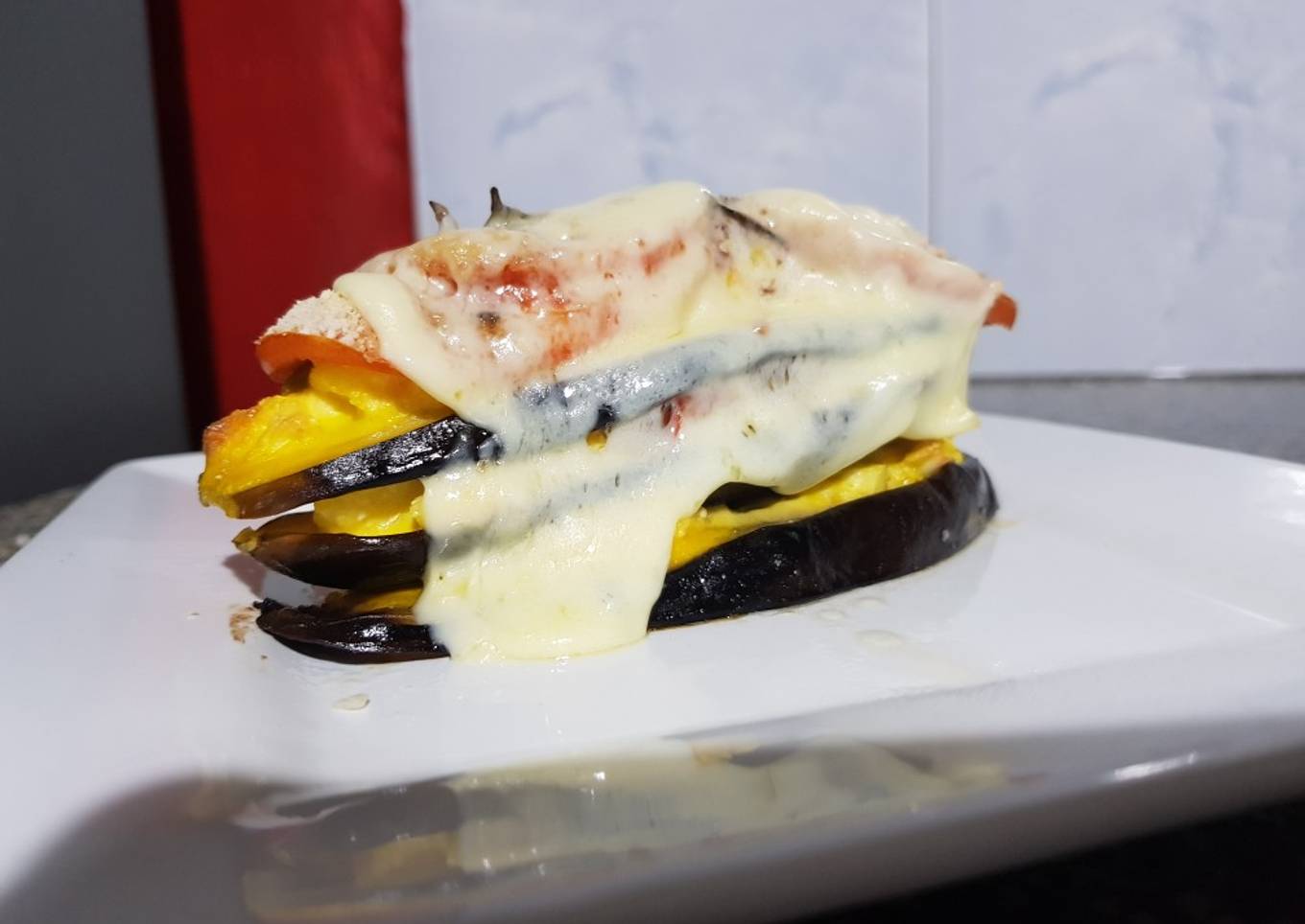 - Armar tipo sándwiches con 3 láminas de berenjena y el relleno entre ellas. Colocarlas en asadera aceitada. Hornear por 15 minutos a 160 grados.