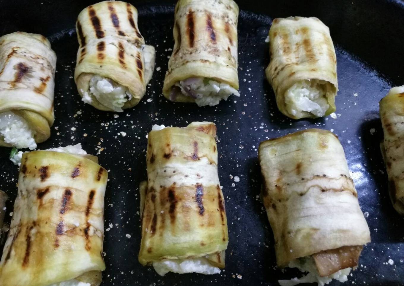 - Se toma cada lonja de berenjena y se rellenan y enrollan y se coloca en asadera para calentar en el momento de comer