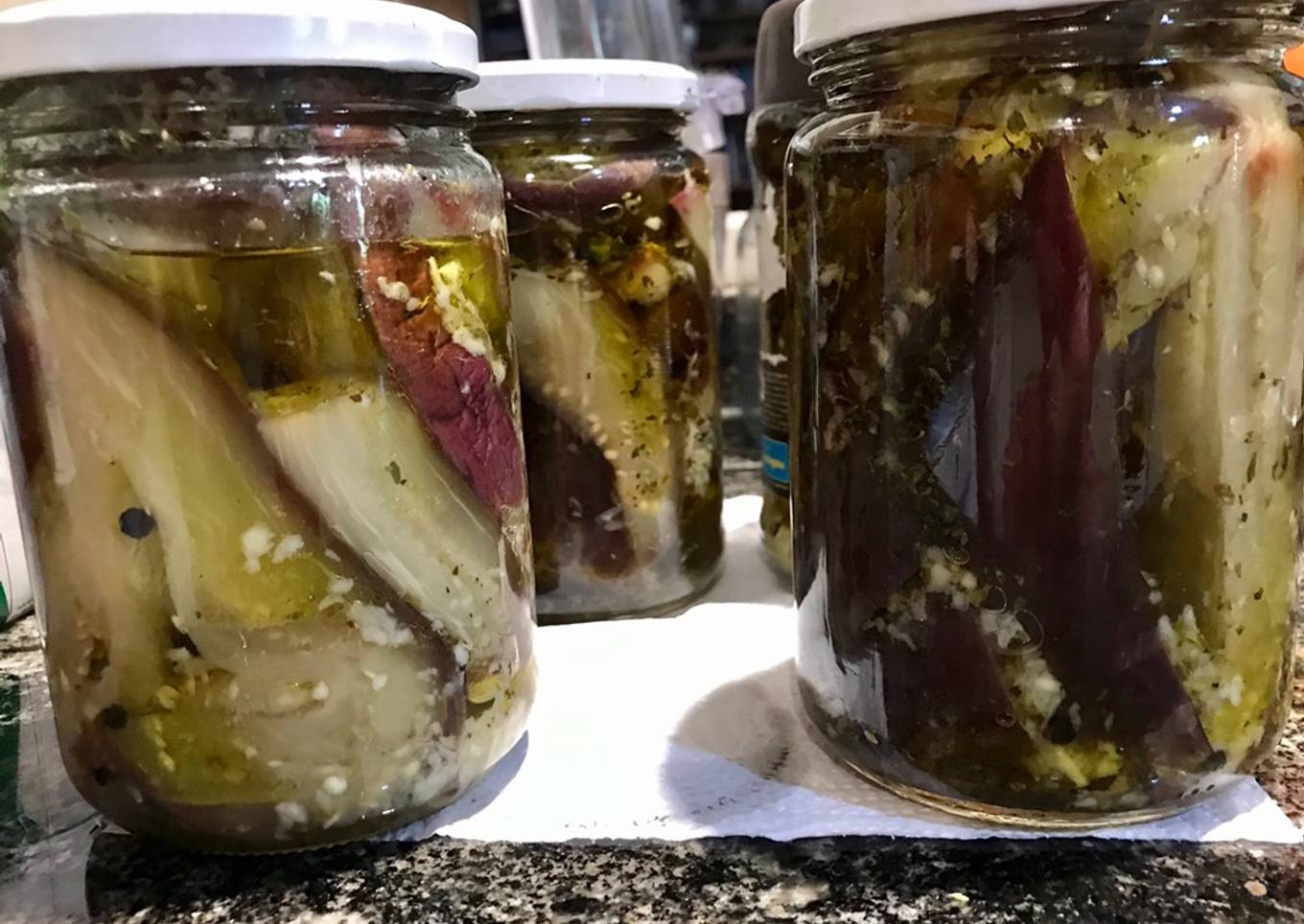 - Se rellenan con las berenjenas. Las coloco a lo largo, y agrego un poco más de condimentos. Al terminar completo con aceite. Yo uso aceite de oliva, pero puede ser otro, siempre de buena calidad, y no mezcla. Dejar reposar, un tiempo, que se acomoden y completar otra vez con aceite. No debe quedar cámara de aire.