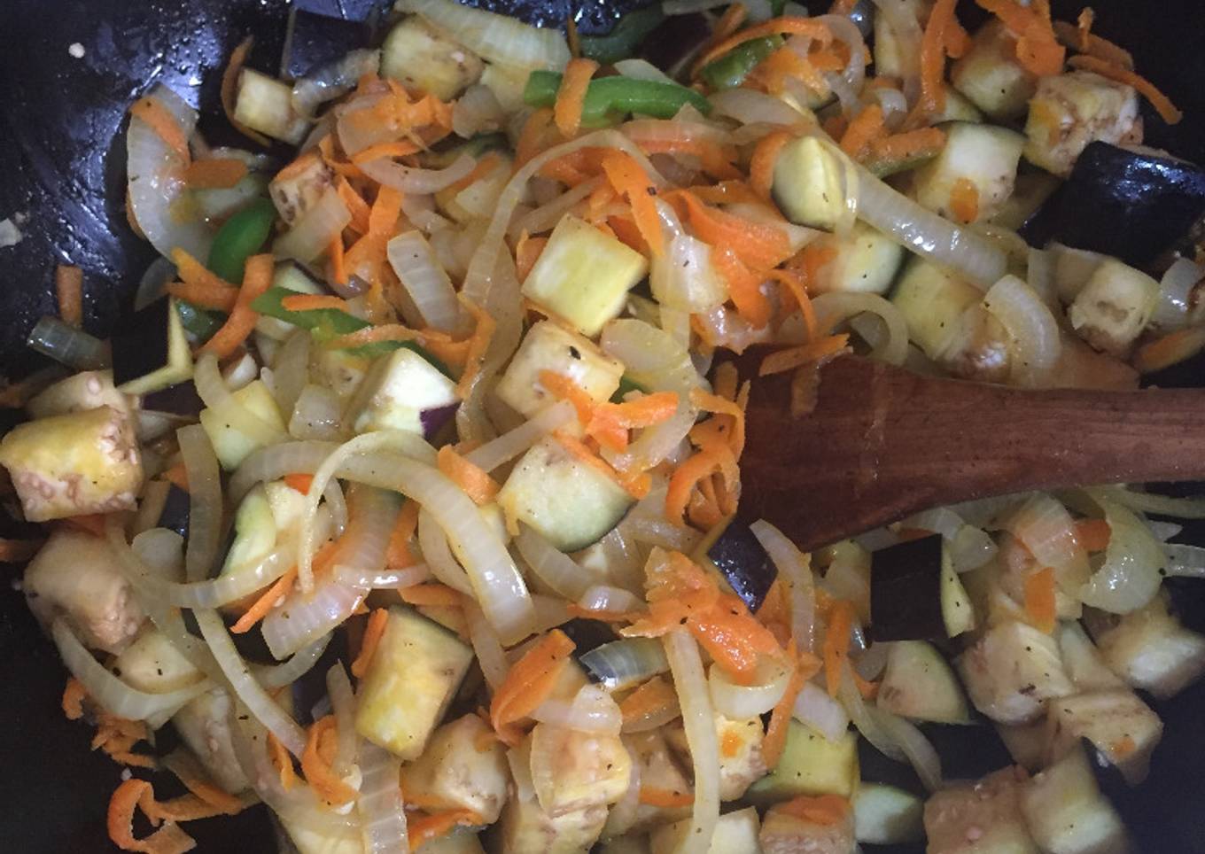 - Mientras lavar las berenjenas reservadas, enjuagar bien y dejar escurrir un instante. Agregarlas a la preparación, integrar bien. Corregir la sazón y continuar la cocción a fuego medio por unos 10 a 12 minutos, hasta que las berenjenas estén cocidas.