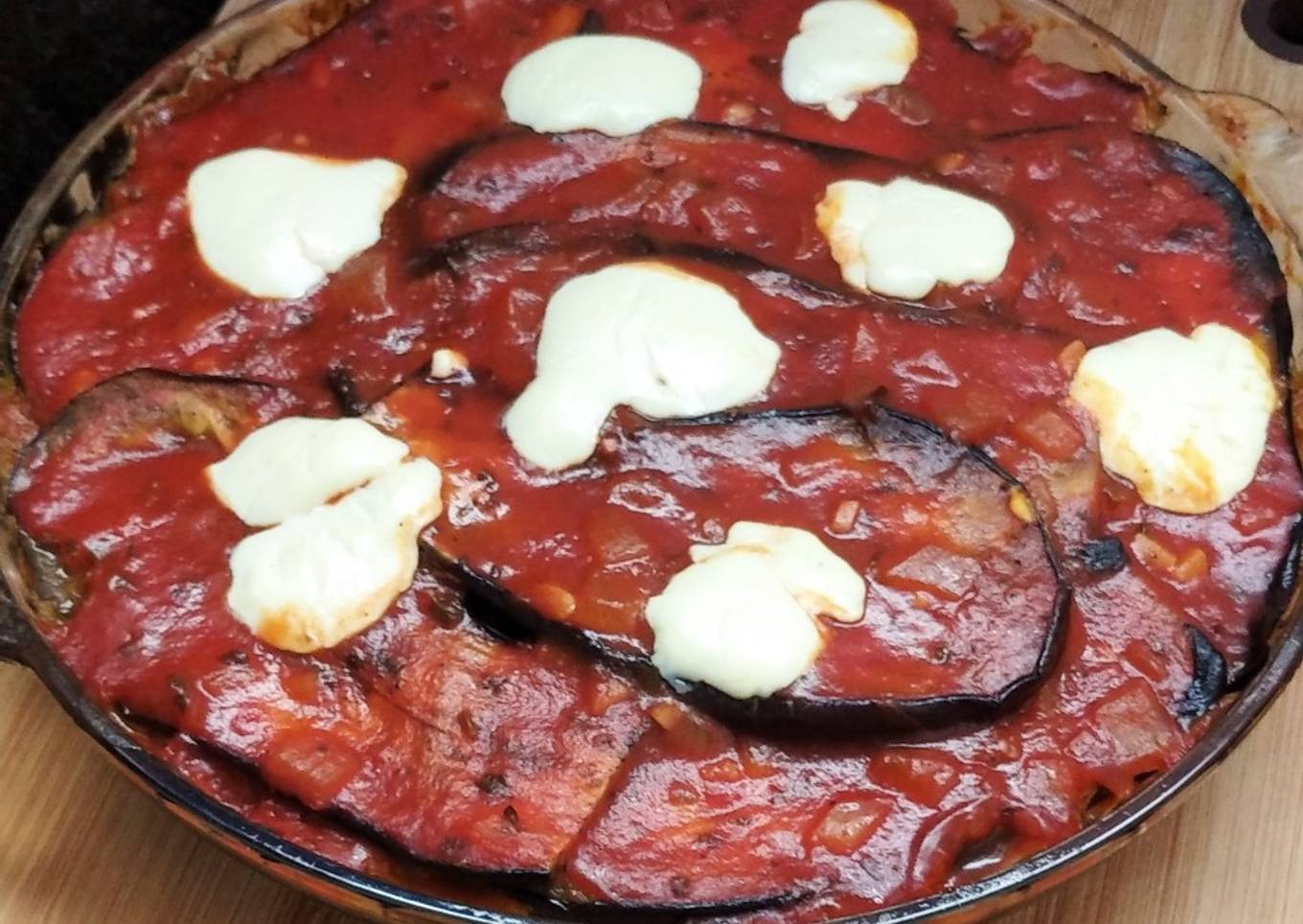 - Armado: Colocar una capa de berenjenas en la asadera, cubrir bien el fondo. Agregar el relleno de espinaca. Colocar otra capa de berenjenas. Luego la capa de puré de calabacín. Otra capa de berenjenas. Terminar con salsa de tomates (usé una que tenía hecha con cebolla, ajo y condimentos). Opcional: se puede agregar arriba de la salsa, muzzarella, queso rallado o queso crema. Tenía solo Casancrem así que le agregué unas cucharaditas.