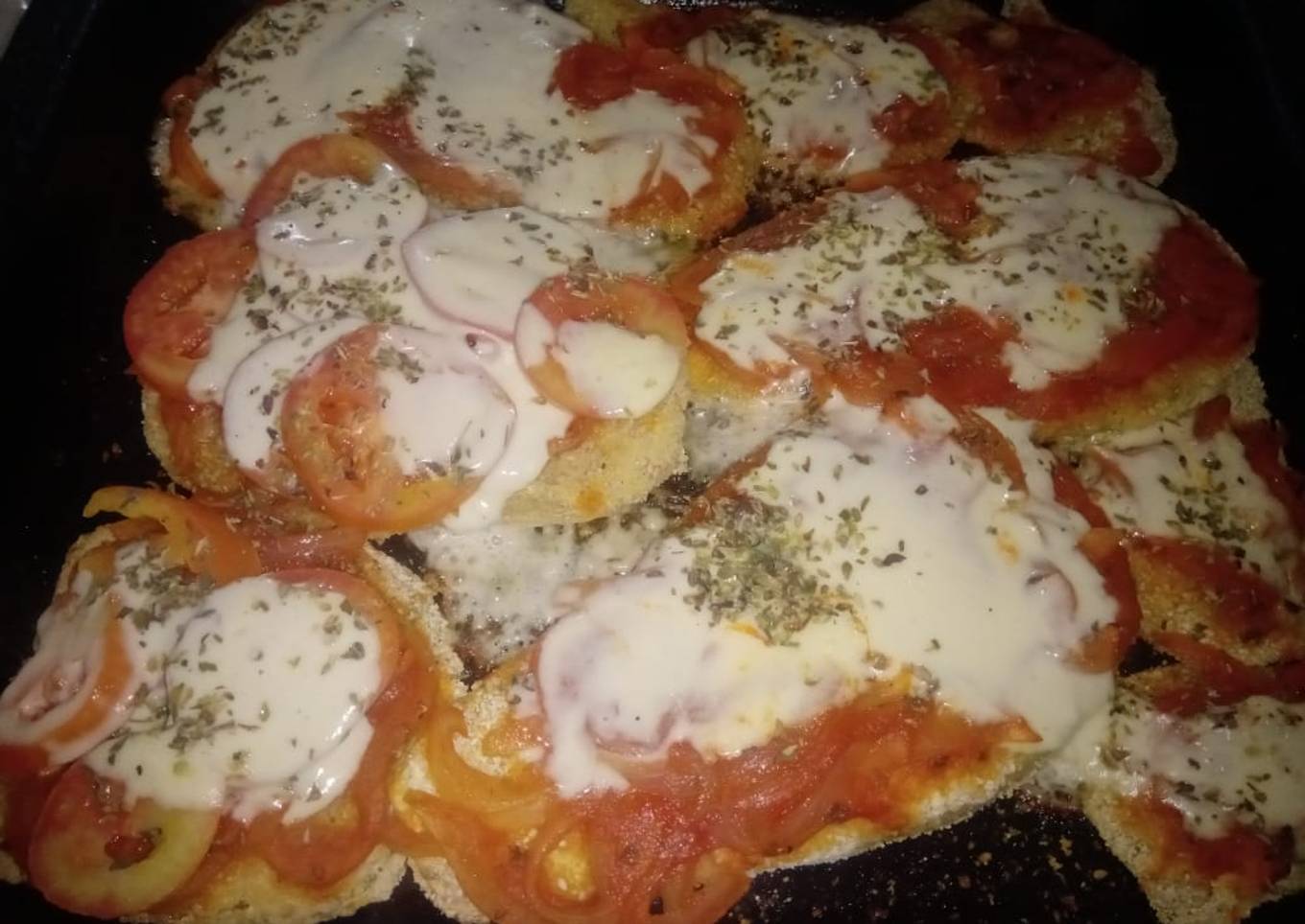 - Para las napolitanas: rebozar las berenjenas, dejar en placa de horno, ponerle la salsa, tomate, queso, espolvorear con orégano y hornear.