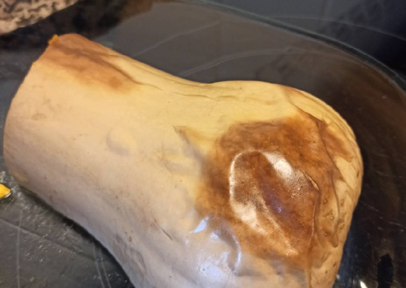 - Partir la calabaza por la mitad a lo largo y ponerla en una fuente para horno con la piel hacia arriba.