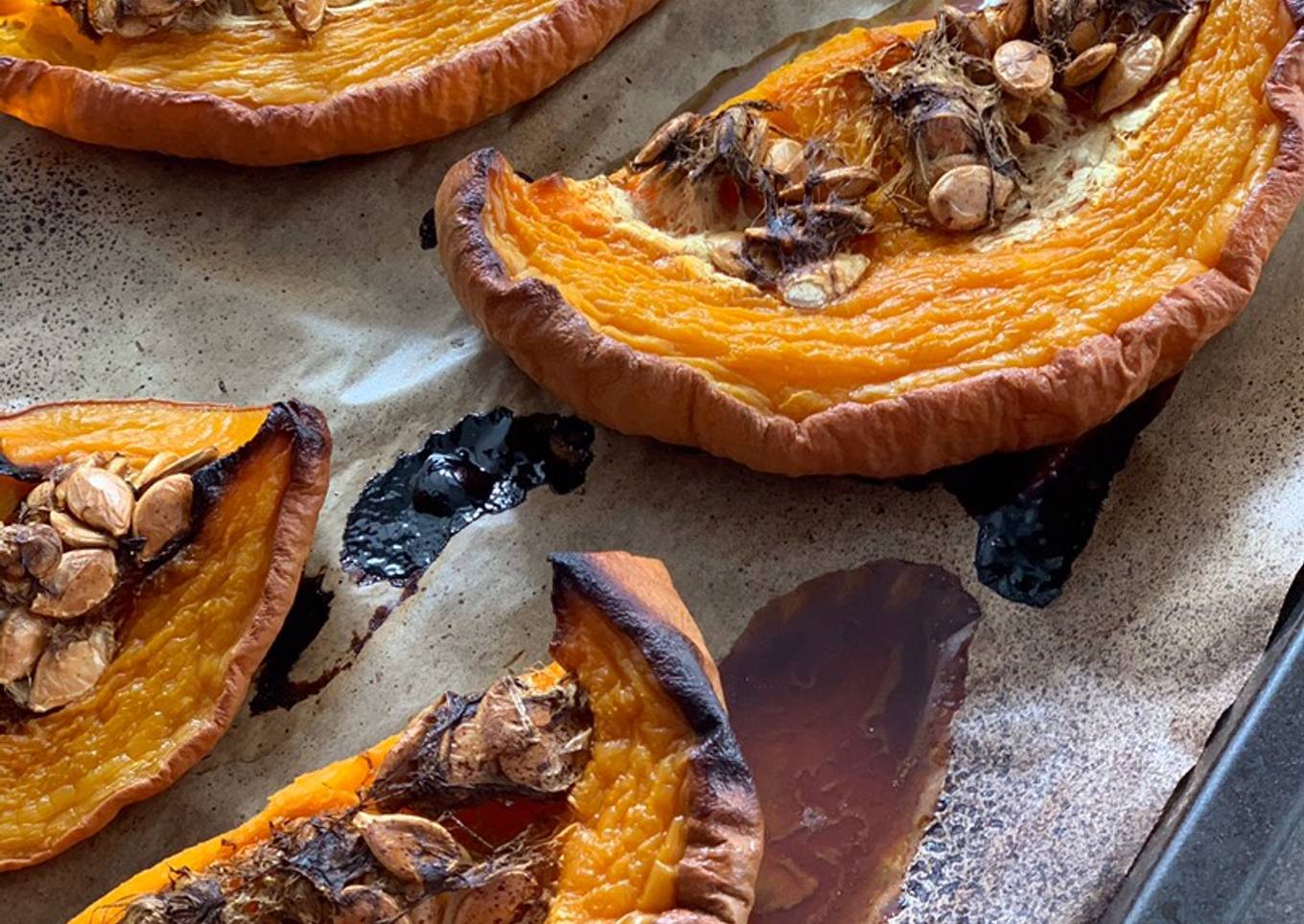- Corta la calabaza por la mitad y luego las mitades en 2.