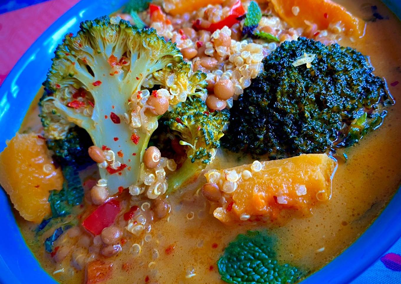 Pero hoy a煤n comemos en casa, y nos hemos hecho uno de nuestro platos favoritos, que no tiene nada que ver con la navidad 馃ぃ Curry Thai de lentejas, con quinoa, br贸coli y calabaza.